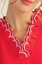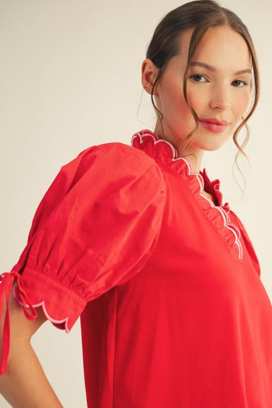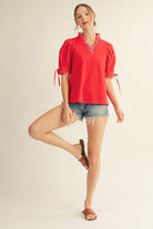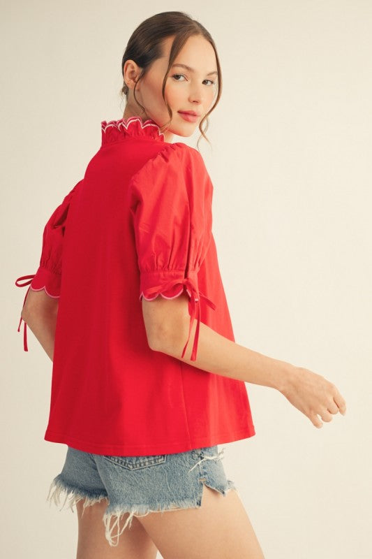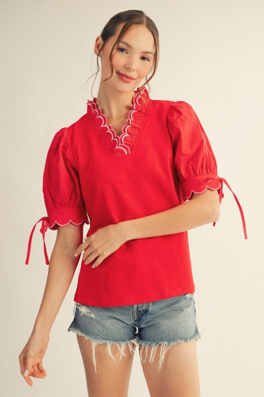 Elevate your wardrobe with the Amy Top, a charming piece that combines timeless elegance with modern flair. This v-neck beauty features delicate short puff sleeves with tie accents and an intricate embroidered scallop edge detail that catches the eye. The layered ruffle neckline adds romantic dimension and movement. Crafted from a comfortable 95% cotton and 5% spandex blend, it offers the perfect balance of breathability and stretch. Pair it with the R7053-BOTTOM skirt for an effortlessly polished look that transitions seamlessly from day to evening.