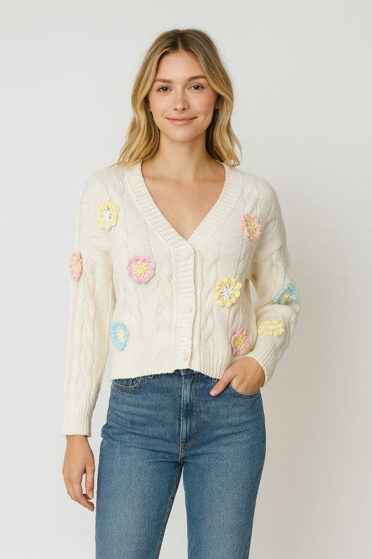 Embrace spring style with this charming cable knit cardigan, where delicate 3D hand-crocheted pastel daisies dance across the front and sleeves. The feminine V-neck silhouette features a flattering cropped cut and smooth front button closure, perfect for layering over your favorite tees or dresses. Crafted from soft, textured yarn, it delivers cozy warmth without sacrificing that fresh, playful aesthetic. Whether you're heading to brunch or a casual weekend outing, this whimsical piece brings instant joy to any wardrobe.