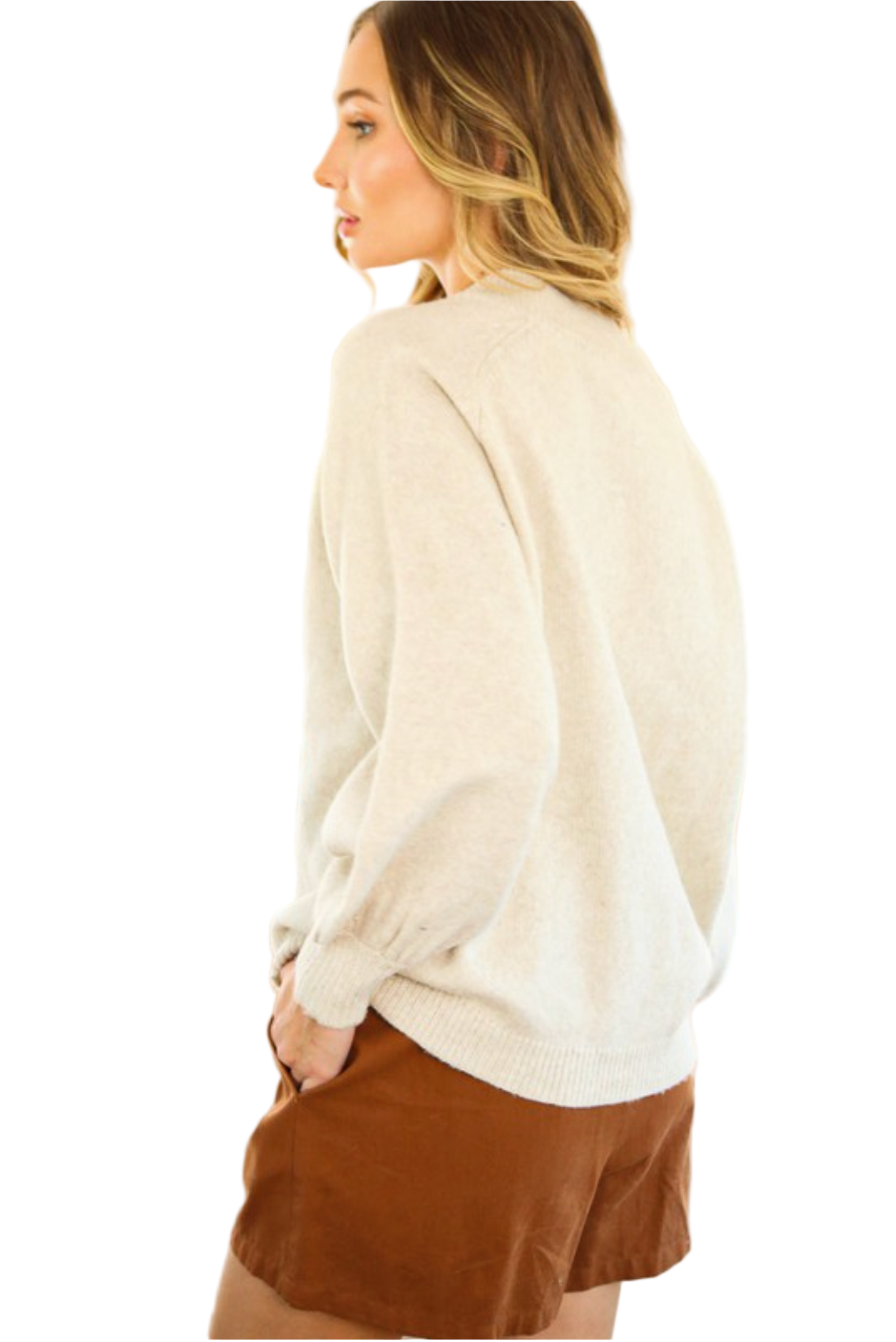 • 1/4" OPEN With Three-Button Front - Raglan style - Long balloon sleeve ribbed hem - Pullover style - Soft touch