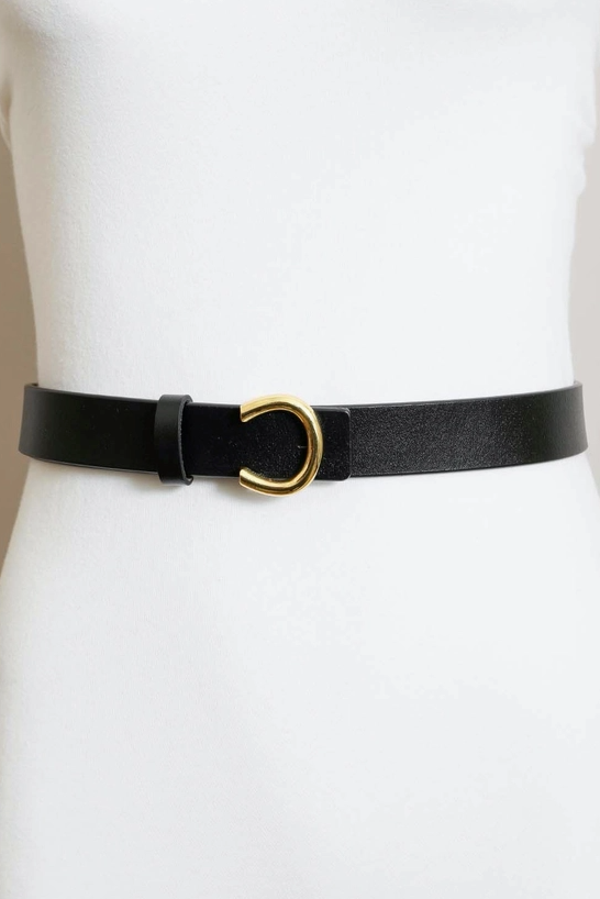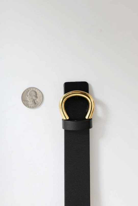Add a dash of minimalist glamour to your collection with the Minimalist Gold Horseshoe Belt. This belt goes beyond mere functionality—it's a refined statement piece. The gold horseshoe buckle lends an air of subtle sophistication, serving as a tasteful centerpiece without overwhelming the look. Designed to be equally at home cinching a sleek dress or adding flair to a pair of tailored trousers, this belt offers a touch of elegance with a modern twist. Stock this versatile accessory to provide your customers with a piece that combines simplicity and luxury in perfect harmony. 100% Genuine Leather Size: 39" Length x 1" Width