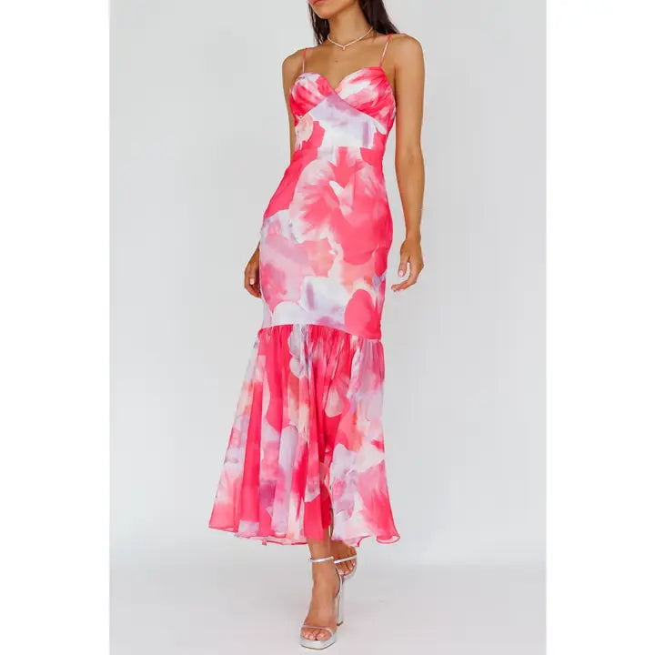 Bring some happiness to your wardrobe with the Marie Dress. This gorgeous maxi features a vibrant color print, flattering padding, and a flounce hem for a playful touch. Fully lined and with a zipper in back, it's as comfortable as it is stylish. Perfect for any occasion!