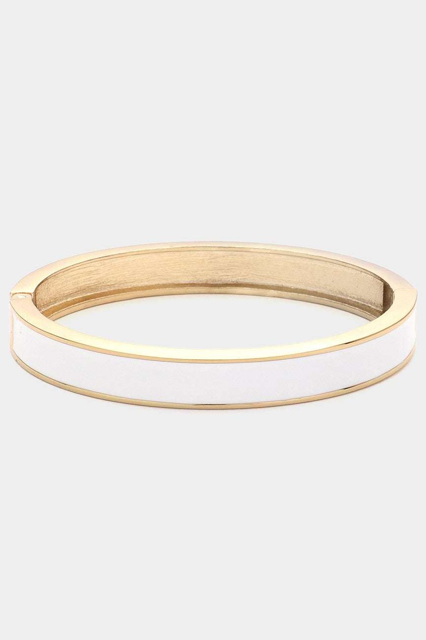 This enamel hinged bangle bracelet is a sleek and elegant addition to any outfit. Made with high-quality materials, it offers both durability and style. Its unique design allows for easy wear and adds a pop of color to your wardrobe. Elevate your look with the Maren Bracelet.