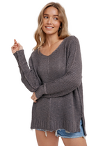 A sheer loose-fit V-neck knit sweater pullover combines relaxed elegance with a lightweight, breathable design. This sweater features a soft, transparent knit fabric that drapes comfortably over the body, offering a casual yet stylish silhouette. The deep V-neckline adds a touch of sophistication, making it versatile for layering over camisoles or bralettes. Perfect for transitional weather, this pullover can be styled for both relaxed and polished looks.