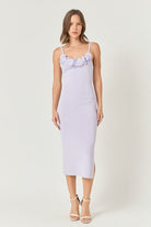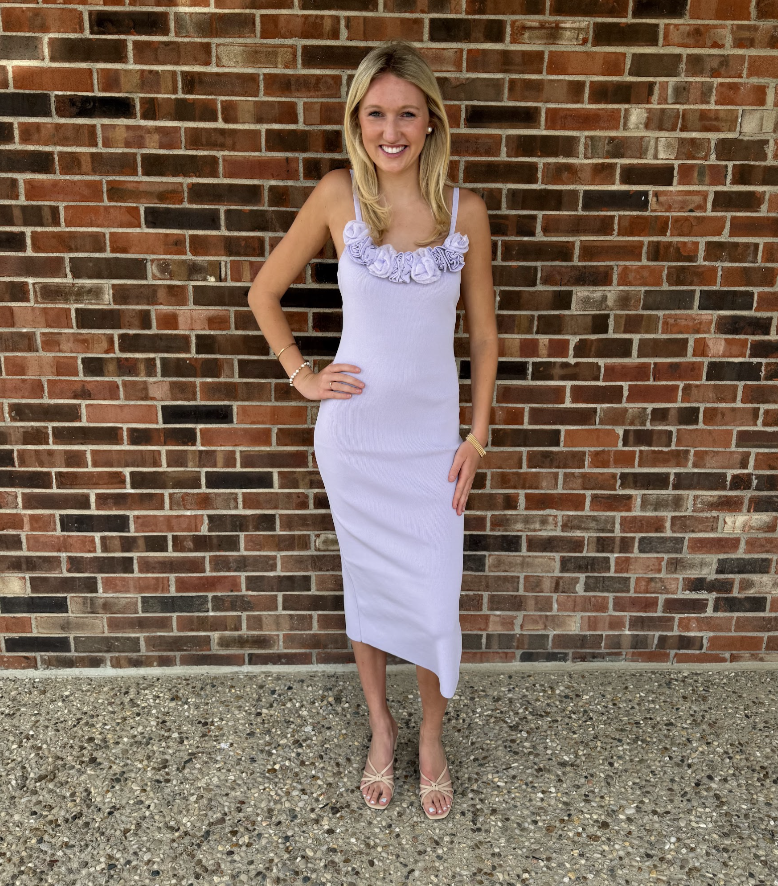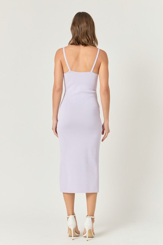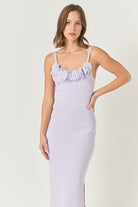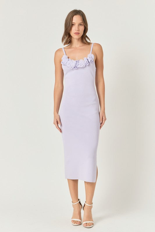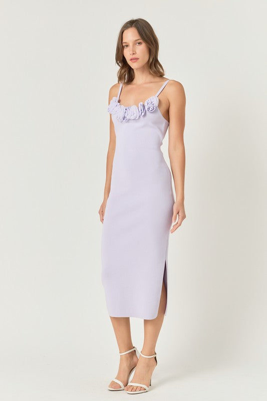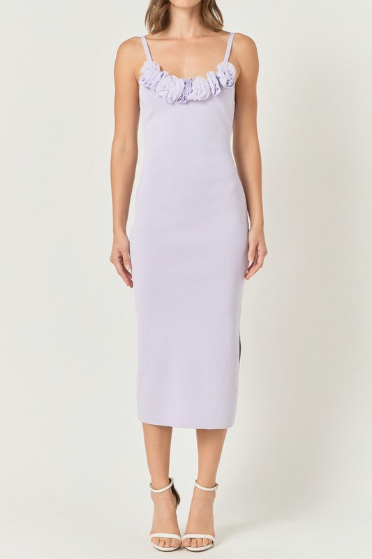 The Emma dress combines comfort and elegance with its knit fabric, midi length, and fitted silhouette. The delicate 3d flower at the neckline adds a touch of femininity, while the shoulder strap and side slit provide a stylish finish. Perfect for any occasion, this dress will make you feel happy and confident.