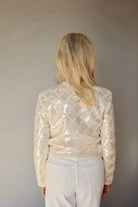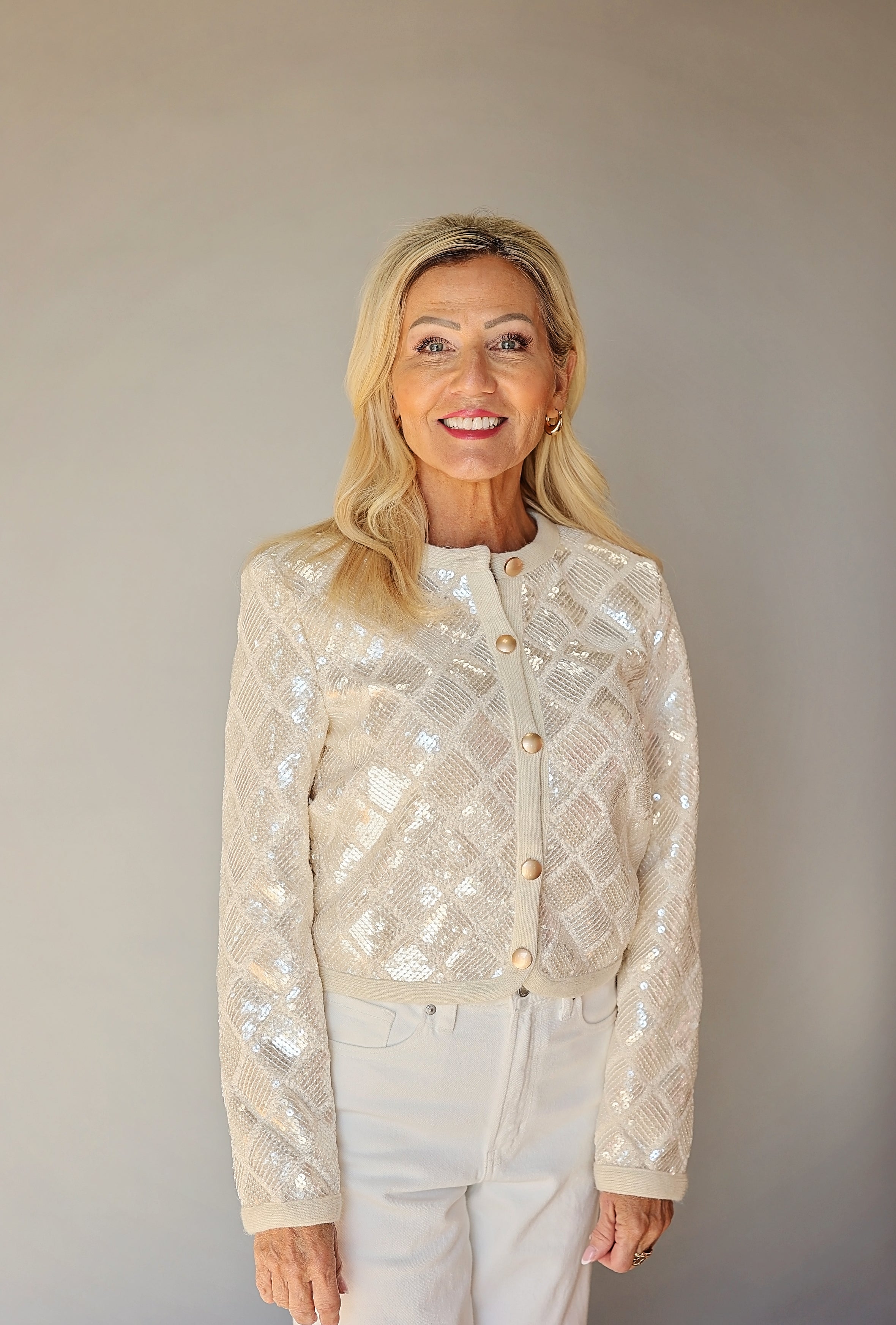 Step out in style with our Gretchen Jacket! This crochet jacket, adorned with stunning sequin patchwork in ivory, will elevate any outfit. Designed for the fashion-forward individual, it's the perfect piece to add some glamour and sparkle to your wardrobe. A must-have for any occasion!