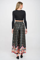 Featuring a bold geometric pattern combined with vibrant floral accents at the hem, these pants are perfect for making a statement. The high-waisted design and relaxed fit provide both comfort and a flattering silhouette, ideal for any occasion. Crafted from lightweight, breathable fabric, these pants are perfect for adding a touch of artistic flair to your wardrobe.
