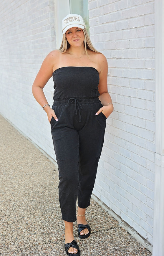 Get ready to turn heads with ease in our Lydia Jumpsuit. This strapless jumpsuit exudes effortless chic with its adjustable waist, elastic band, and drawstring for the perfect fit. The barrel/tapered leg design and knee darts provide maximum comfort and movement, while waist darts flatter your figure. Don't forget the inseam side pockets for added convenience. A must-have for any fashion-forward woman!