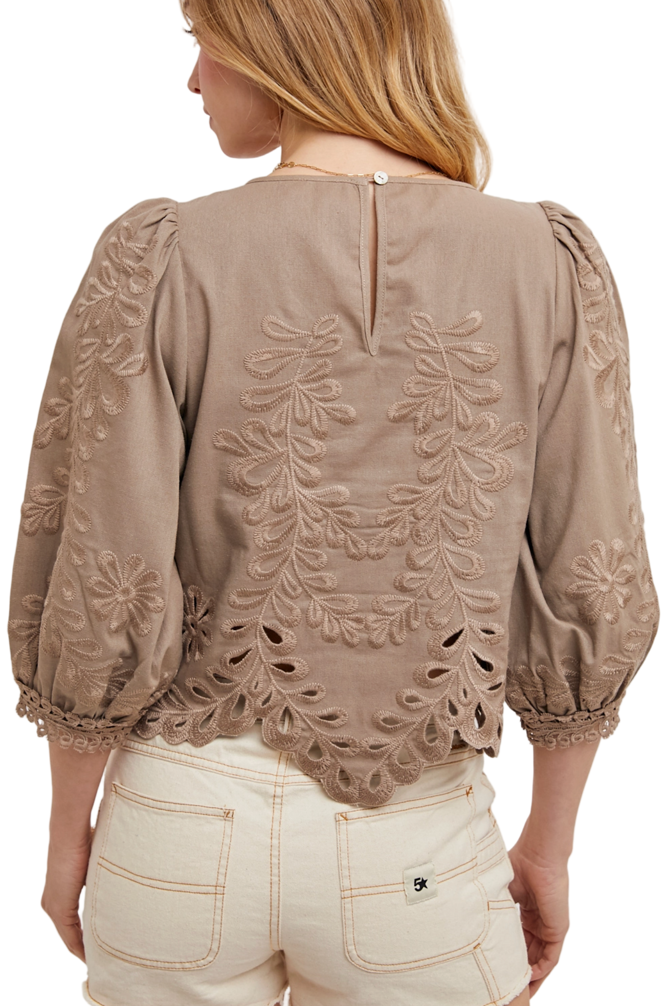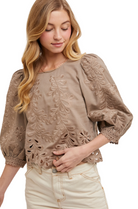The lace cutout bottom hem bubble-sleeved top is a stylish blend of elegance and charm. Featuring delicate lace cutout details along the hem, this top adds a touch of femininity and sophistication. The voluminous bubble sleeves enhance its trendy, modern appeal, creating a balanced silhouette. Perfect for both casual and dressy occasions, this top pairs effortlessly with jeans for a relaxed look or a sleek skirt for a more polished outfit.