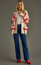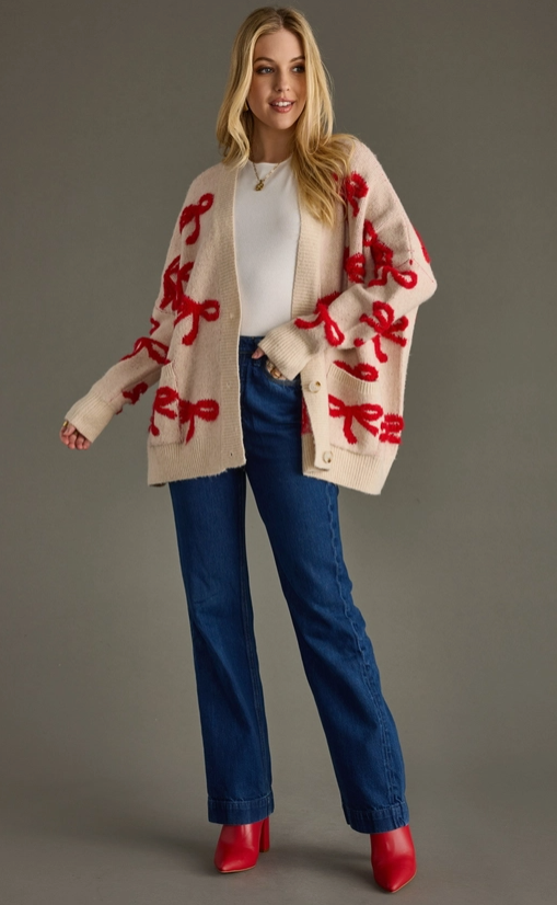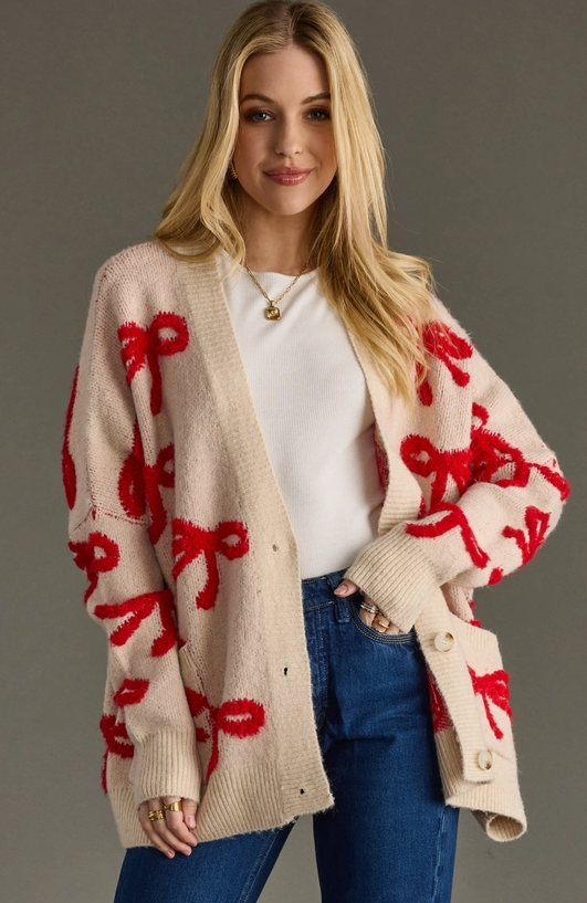 Our trendy tan with pink bow Sweater is a must-have this Holiday Season