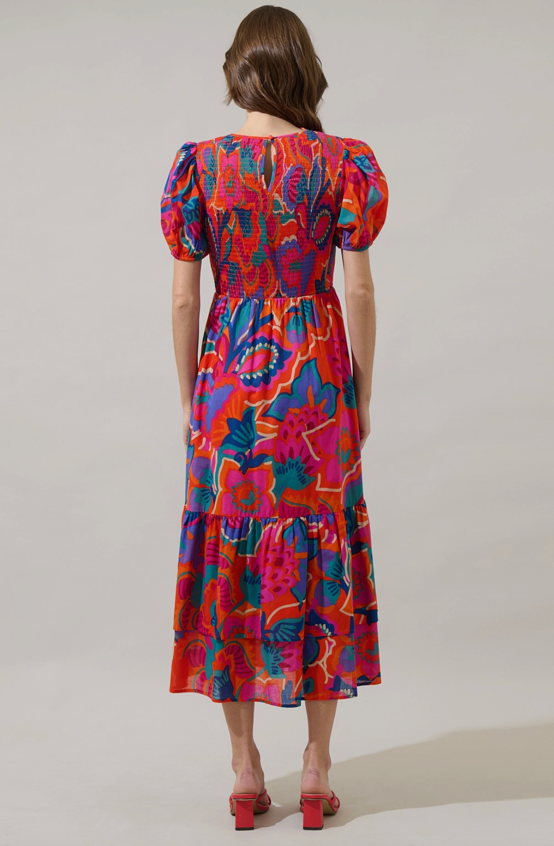 A day full of adventure awaits you and the Kahlia Tropics Aruba Smocked Midi Dress will be your companion. A bright orange multi print features short puff sleeves with elastic, smocked body, and a round neckline. It has pockets and a keyhole in the back for ease. Pair the look with a cute sandals or heels. -