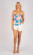 The Weston Tank brings joy to your wardrobe with its vibrant pattern and flattering spaghetti strap and cowl neck design. Perfect for any occasion, this tank will elevate your style with its playful yet elegant look. A must-have for a happy and confident you.