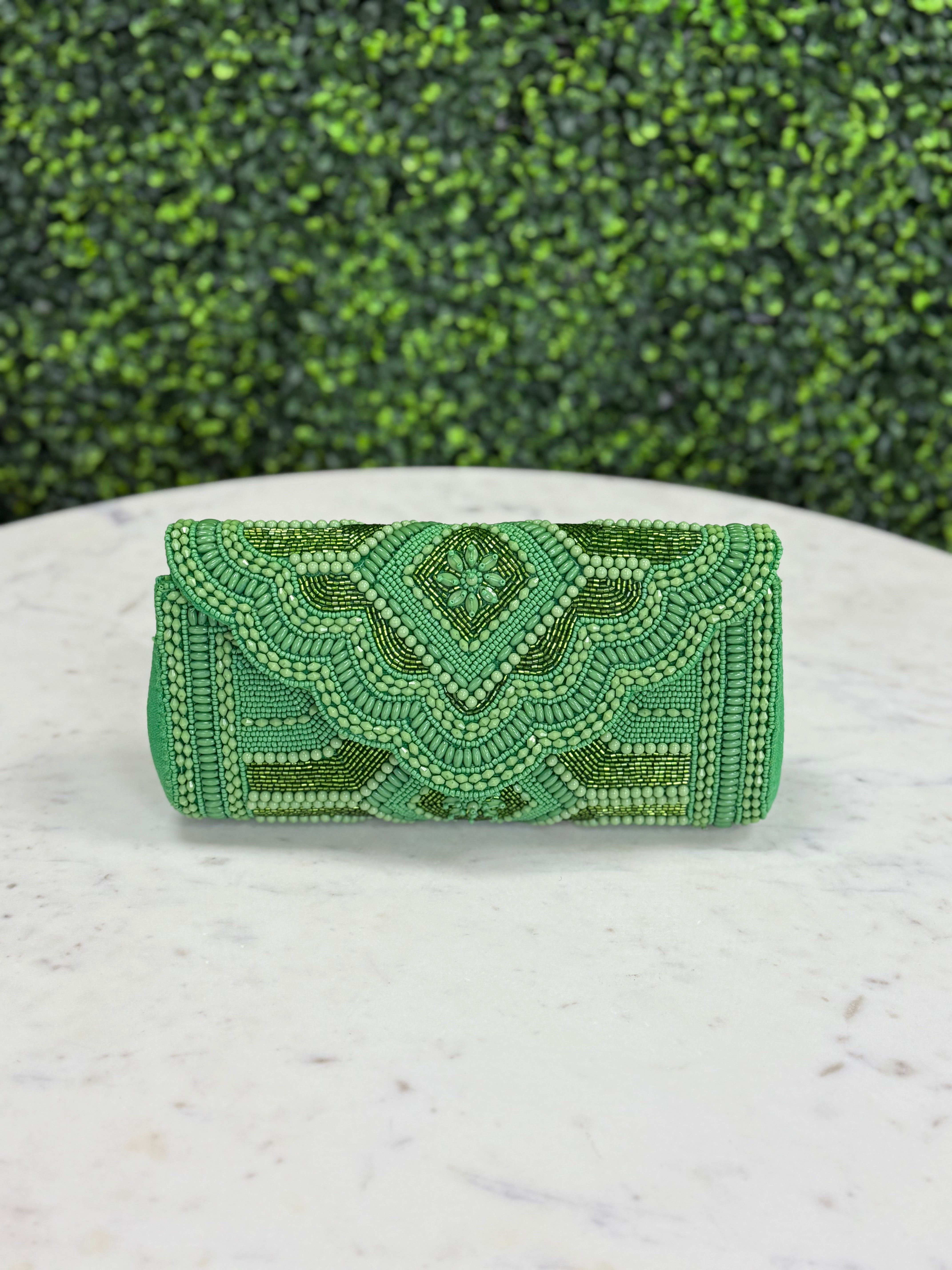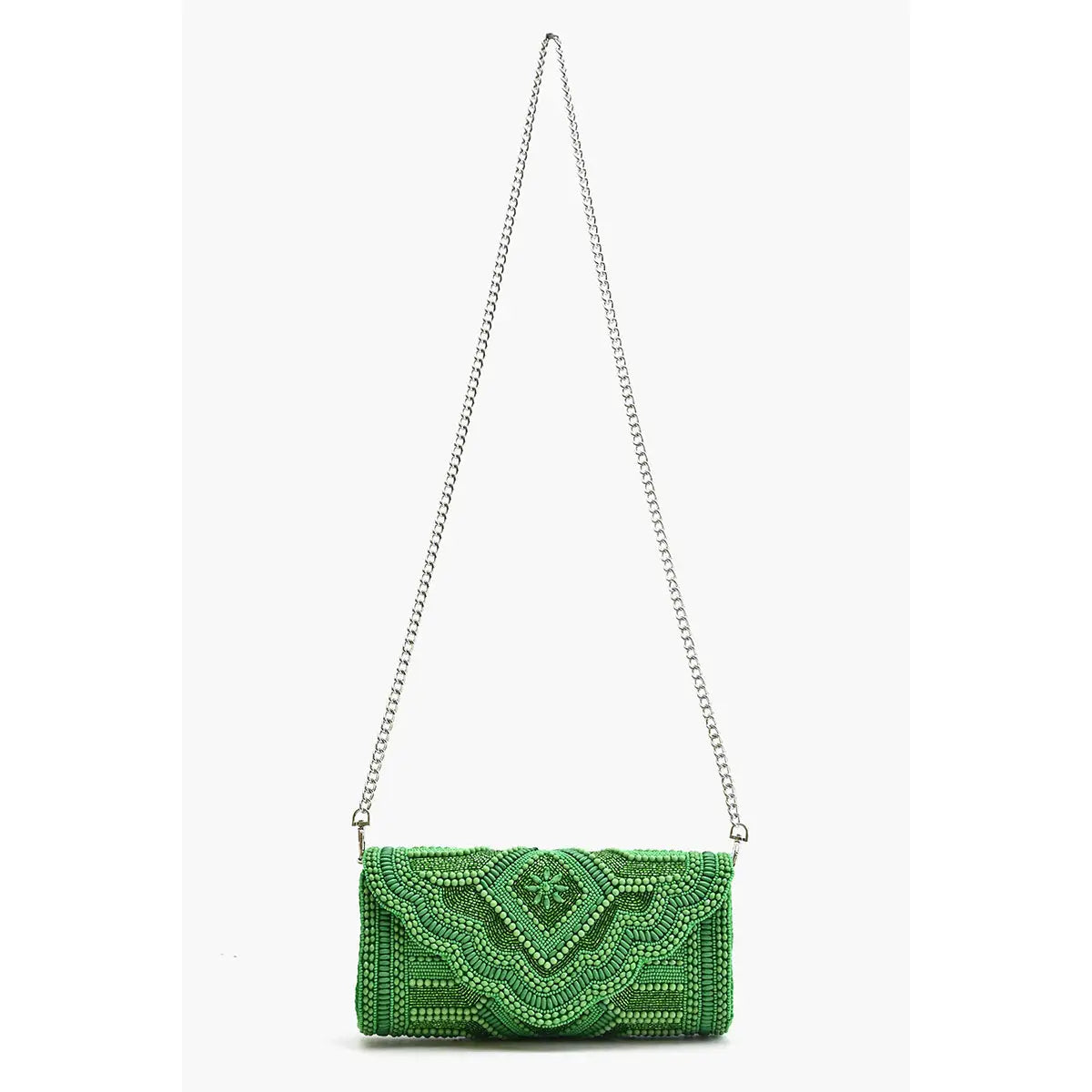 Sparkle through the night with our Green Jewel Evening Bag! This versatile clutch transforms into a crossbody with its detachable chain strap, keeping your essentials secure while leaving hands free for dancing or holding drinks. The elegant beaded design catches the light beautifully, adding the perfect finishing touch to any evening ensemble!