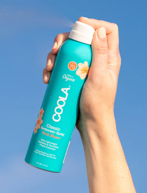 Peach blossom scented, clear SPF 70 non-aerosol sunscreen that sprays on easily.