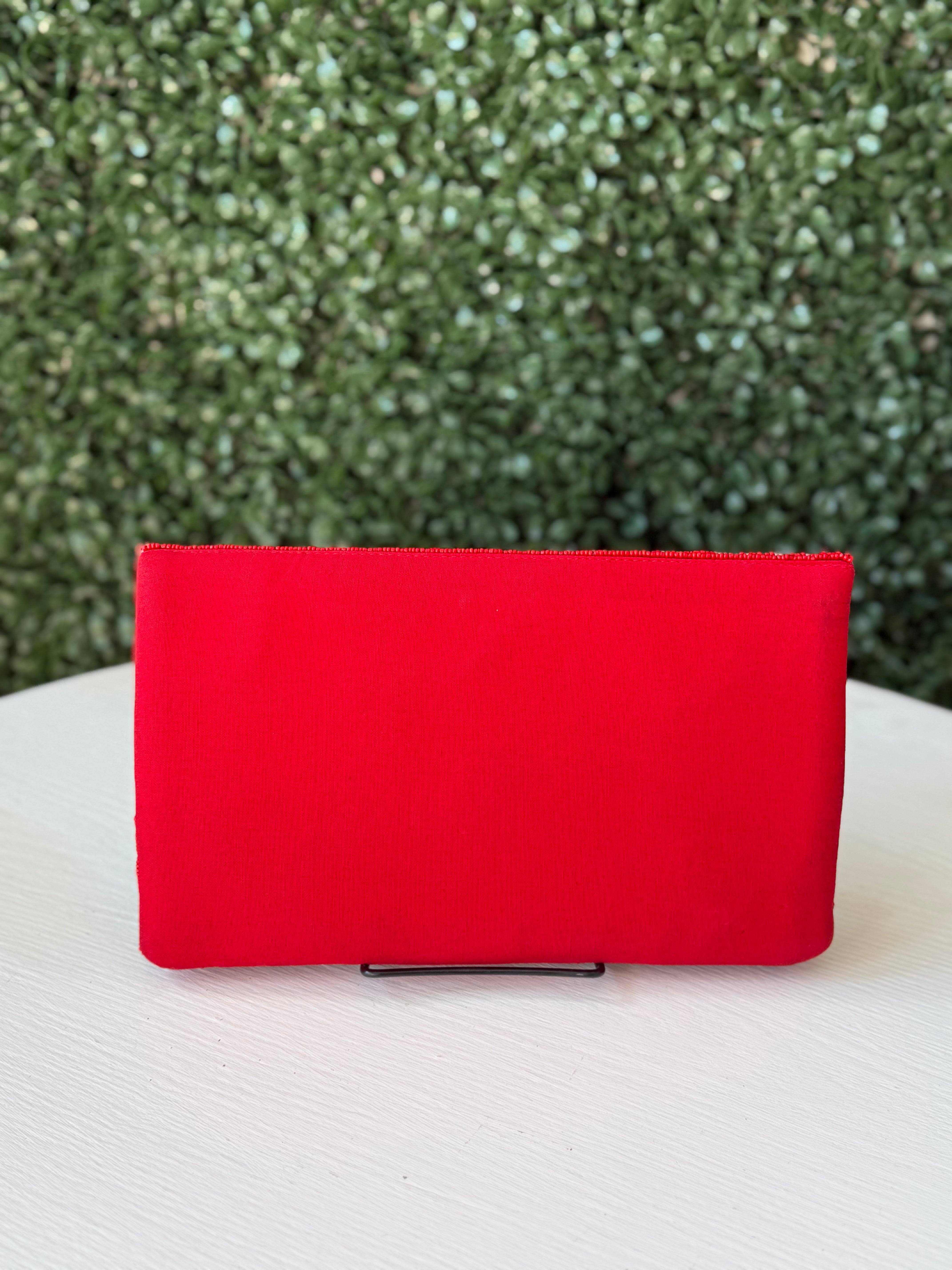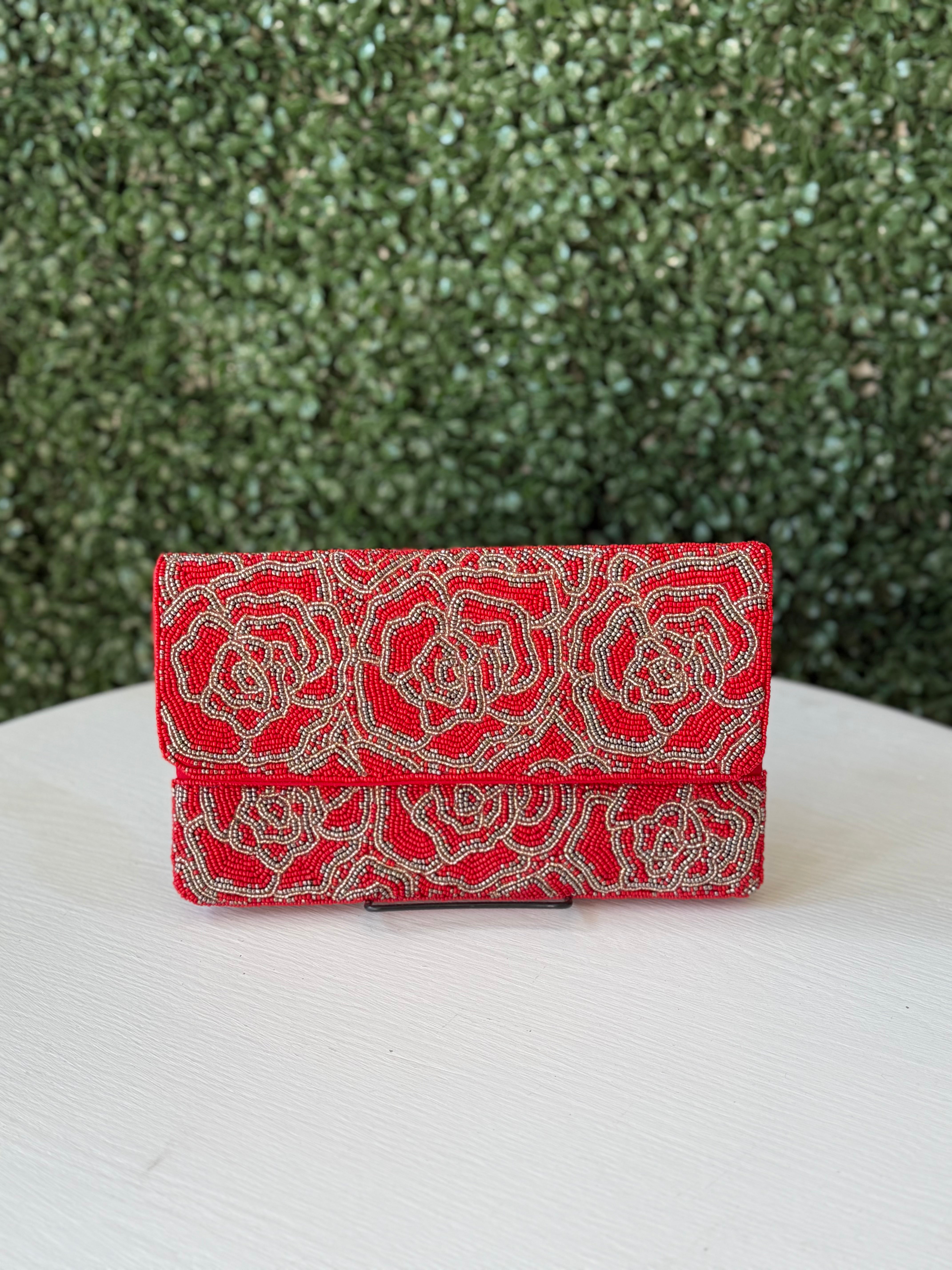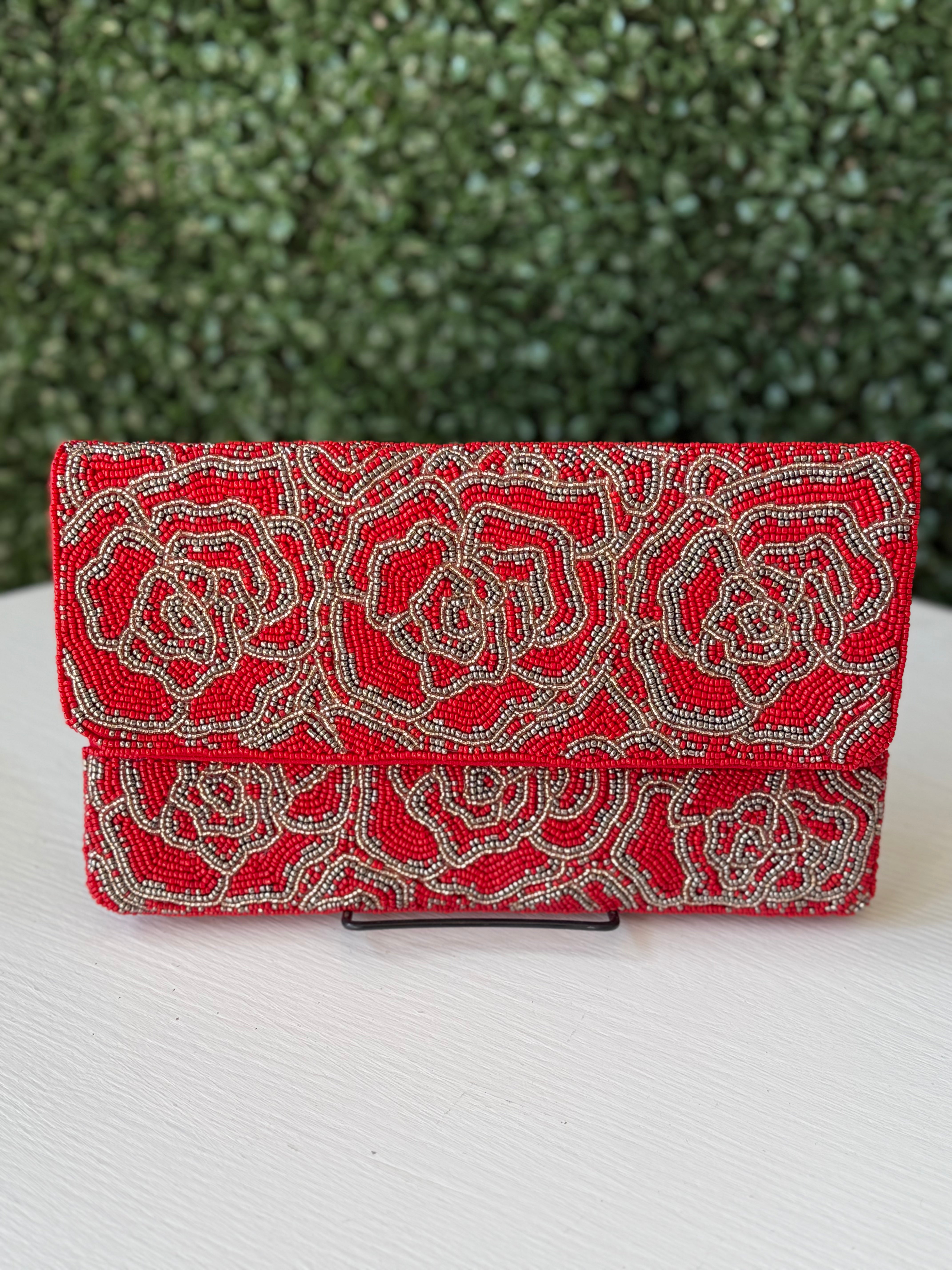 Rock a bold look with our red & grey Beaded Clutch featuring a vibrant twist of Red Roses. This playful accessory adds a touch of sass to any outfit. Perfect for a night out or a special occasion. (Flowers included, of course!)
