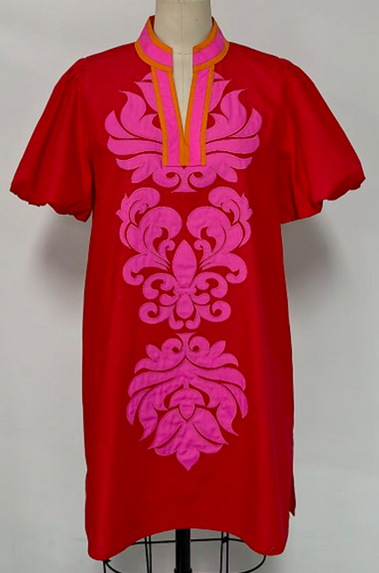 The Bodi Dress Navy features an elegant baroque applique detail that elevates its classic shift silhouette. Short puff sleeves frame the shoulders while a standing neckline with notched V-neck creates refined visual interest. The relaxed shift cut offers comfortable, flattering wear for various occasions. True to size, this piece works beautifully layered or worn solo for understated sophistication.