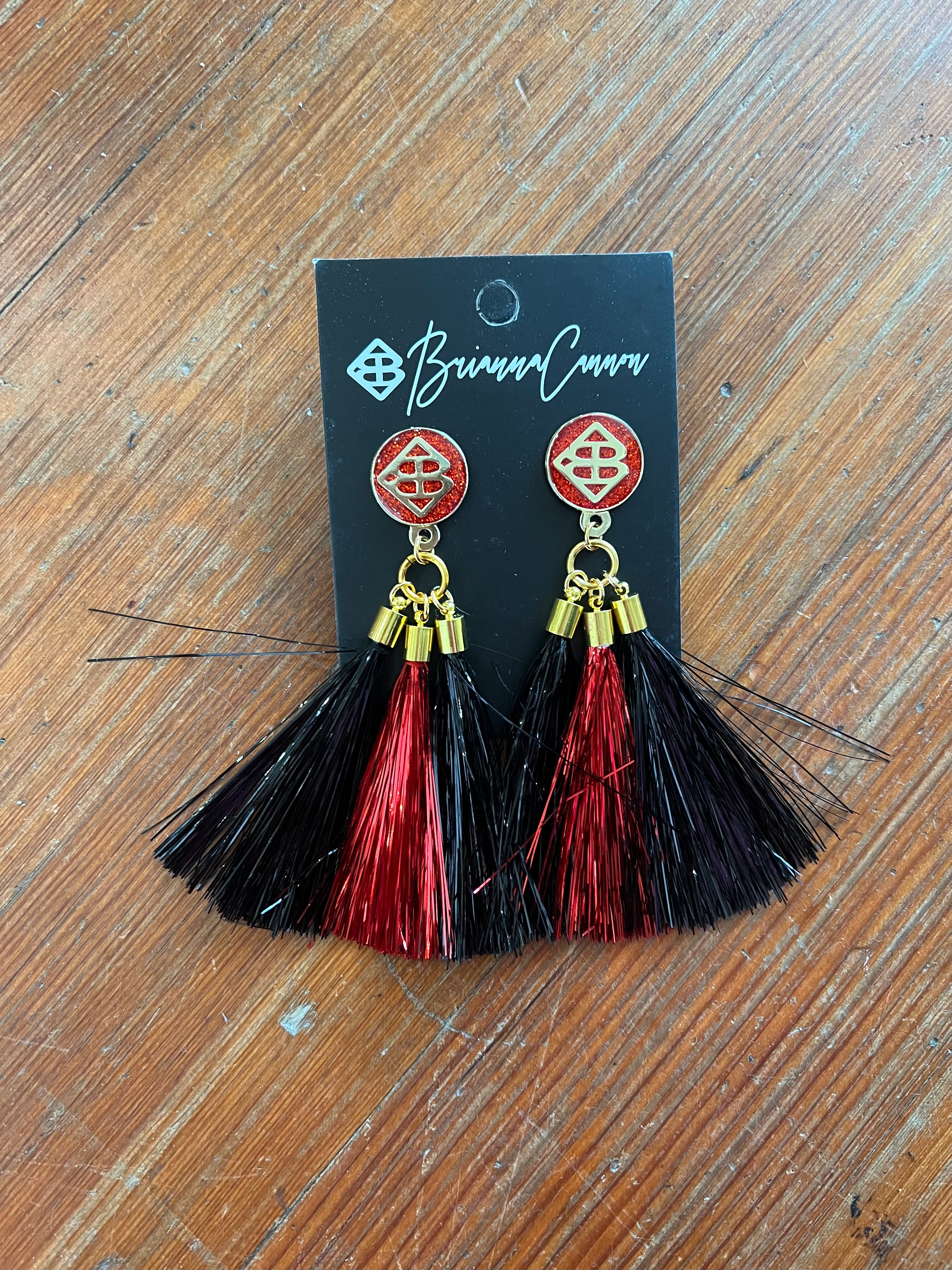 Red and black metallic tassels. Features gold plated BC trademark logo top. Measures 2.5" in length