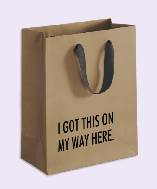 Bag text: I got this on my way here.
