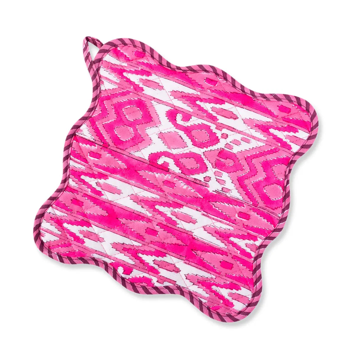 Chic and timeless, this pretty blockprint pot holder elevates the everyday and adds a colorful charm to your kitchen. Handmade in India, the charming color combo and the striped trim make a bold statement. By opting for sustainable table linens over disposable, we can help cut down on waste and support an age-old craft by artisans in Jaipur.