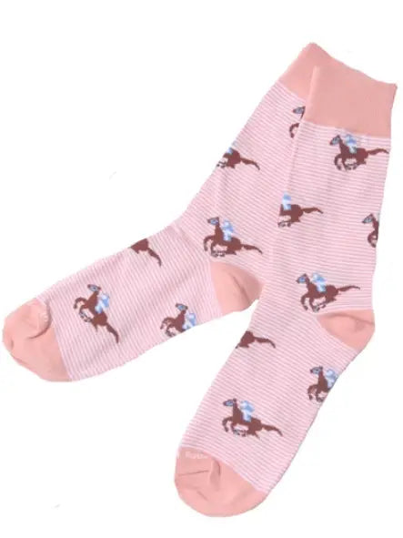 Add a spring twist to your wardrobe with our classic Striped Socks. These socks feature a fun design of racehorse and horseshoe icons in a peach and white stripe pattern.
