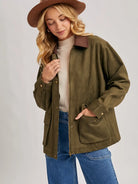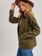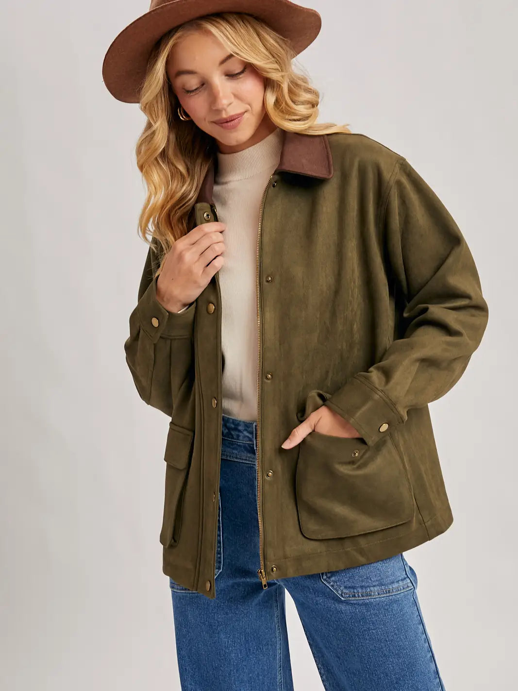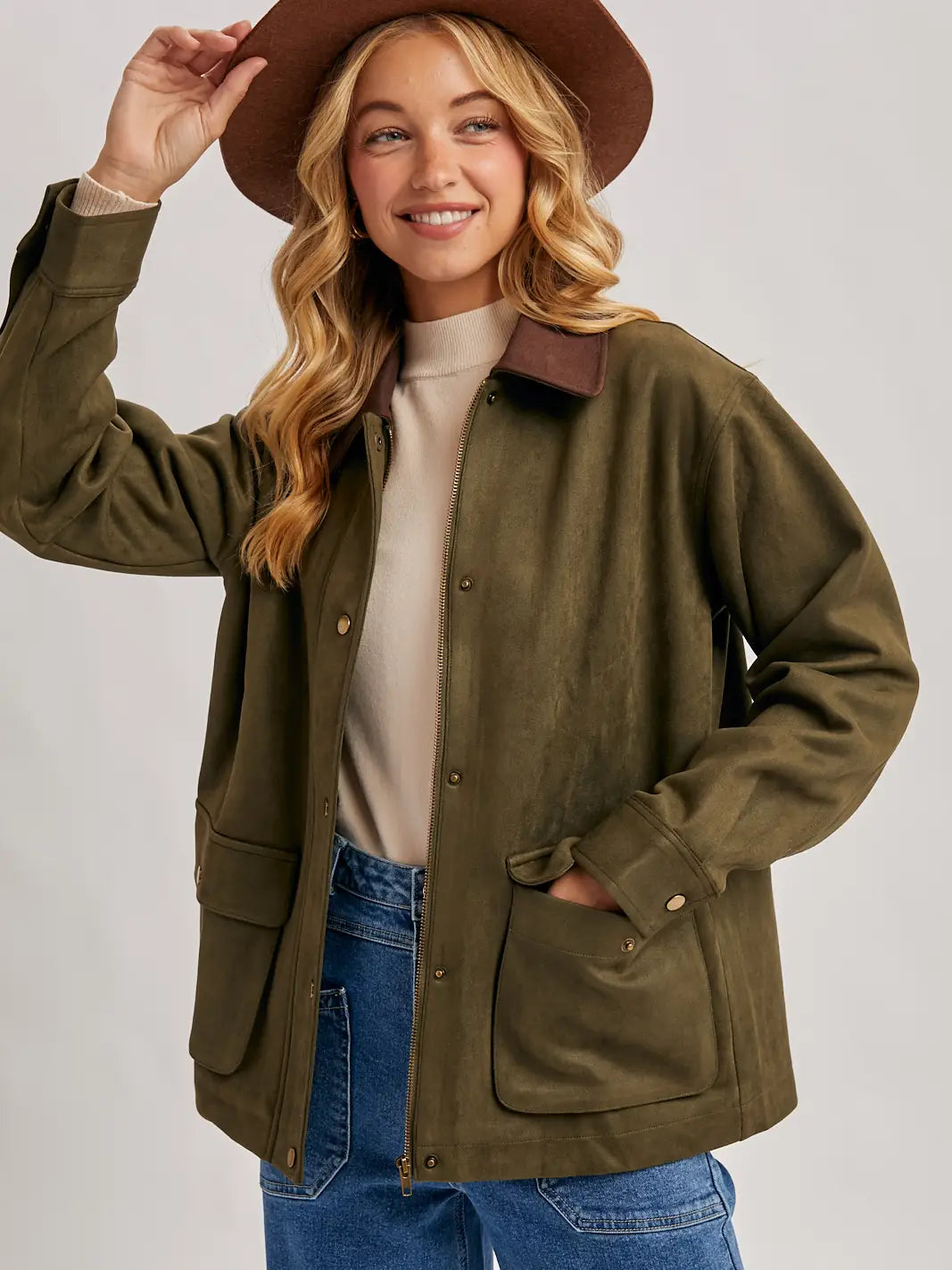 This is a stylish and functional utility-style jacket, crafted from a soft, faux suede fabric that gives it a rich, tactile appearance. It features a distinctive dark brown contrasting collar in a similar suede-like material, adding a classic, rustic touch to the design. The jacket is designed with a practical dual-closure system, including a full-zip front and an overlying storm placket secured with coordinating antique brass snap buttons for added protection and style. Two large, functional patch pockets with snap-flap closures adorn the front, enhancing the utilitarian aesthetic while providing ample storage. The jacket has a relaxed, slightly boxy silhouette that hits at the hip, with long sleeves finished with adjustable snap-button cuffs.
