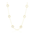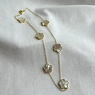 This Addie Clover Necklace is crafted with Mother of Pearl to create an exquisite and shimmering accessory. The pearly finish and unique clover shape make it a timeless piece that you can take from day to night with ease! * 19" + 1" Ext * 12mm: 16" + 2" Ext * 15mm: 19" + 3" Ext *18k gold plated over stainless steel * Water & tarnish resistant