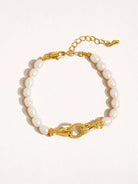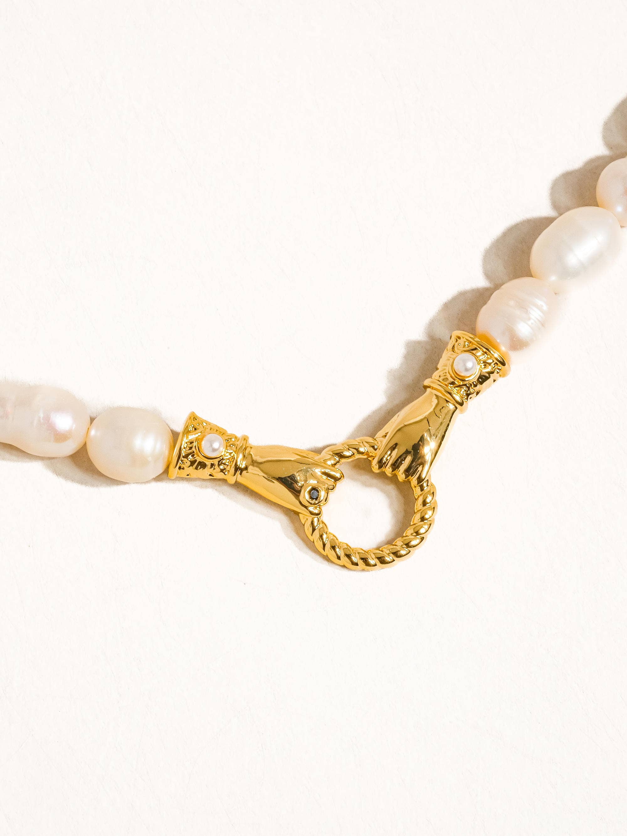 18K Gold Pearl Hand-in-Hand Hoop Necklace NECKLACE 18K gold Plating Freshwater Pearl Brass Pendant Size (inch): 0.42 Diameter Chain Length (inch): 15 Extension Length (inch): 2 BRACELET 18K gold Plating Freshwater Pearl Brass Pendant Size (inch): 0.42 Diameter Chain Length (inch): 6.5 Extension Length (inch): 2.5 - Lead and Nickel Free