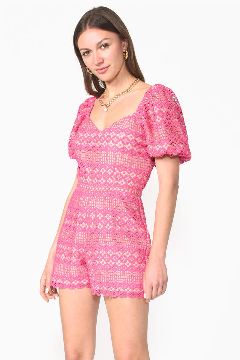 Indulge in the luxurious elegance of our Whitley Romper. This stunning piece features a delicate pink crochet lace design, with a tie back detail that adds a touch of sophistication. Perfect for any occasion, this romper will make you feel like a true fashionista.