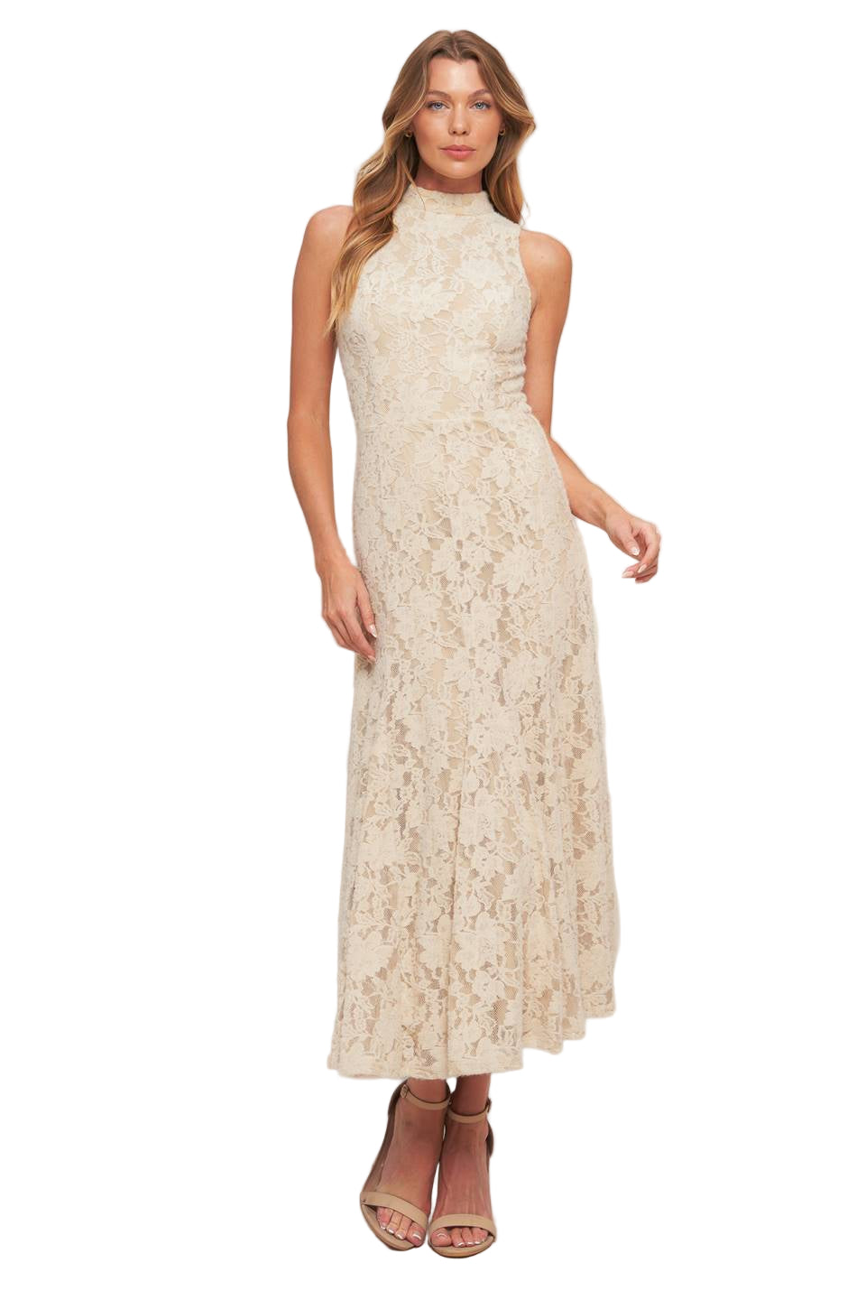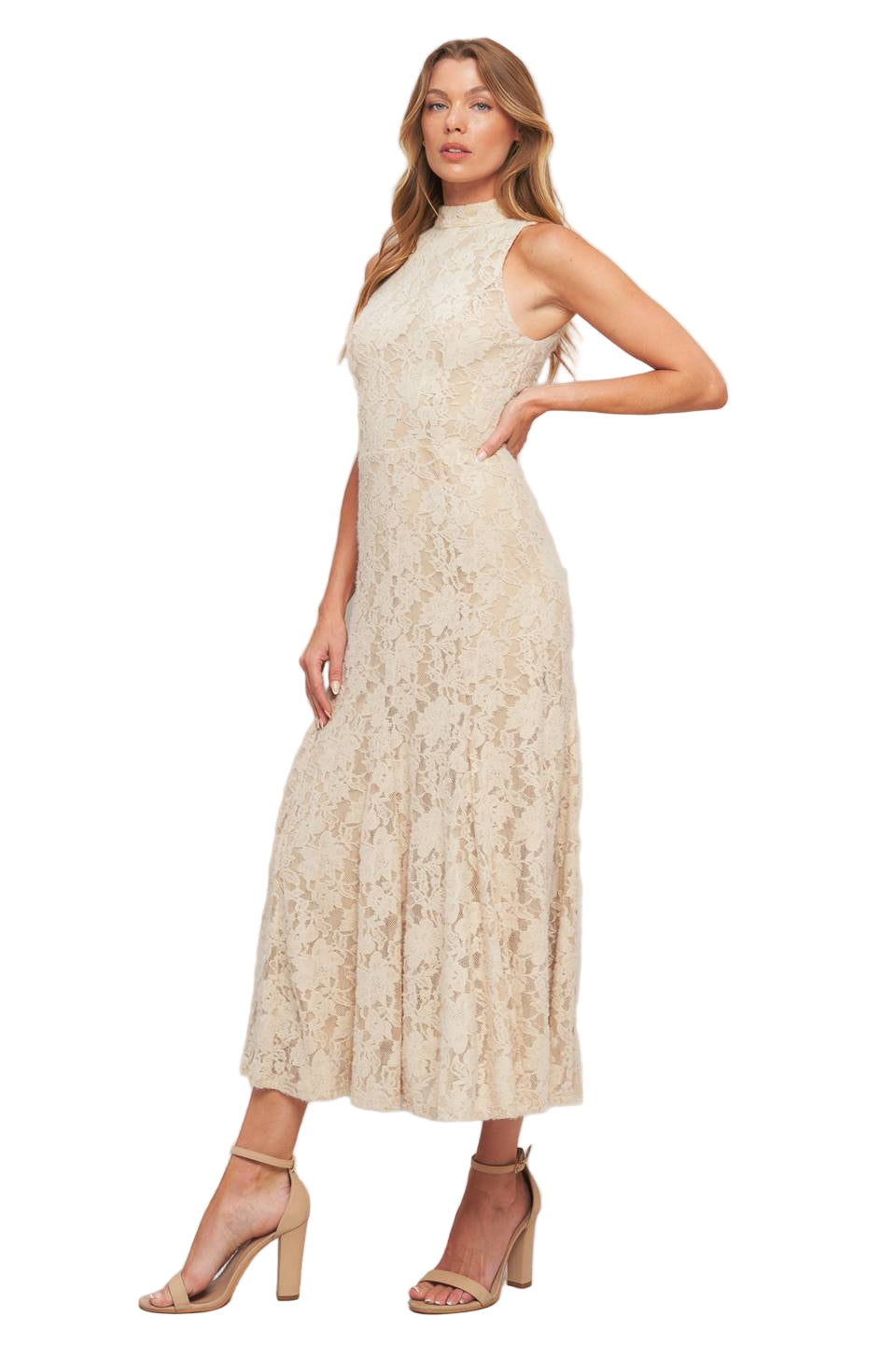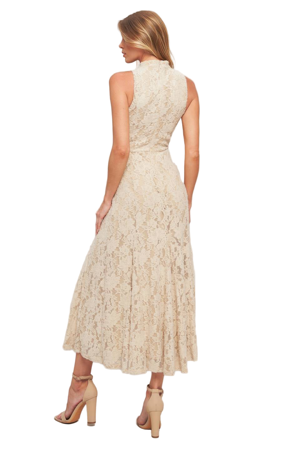 A stretch lace midi dress featuring mock neckline, sleeveless and back zipper closure