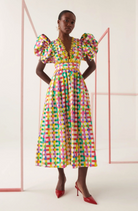 An all time brand favorite, the curazao multi dress is the perfect pick for a friendly lunch! With its characteristic puff sleeves, deep v-neck with a scalloed yellow edge, cinch-belted waist and long flowing skirt. With a colorful checkered pattern, closed by a strap in the back and a side zip with side pockets too!