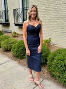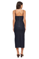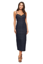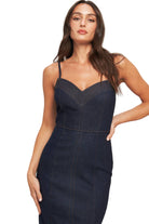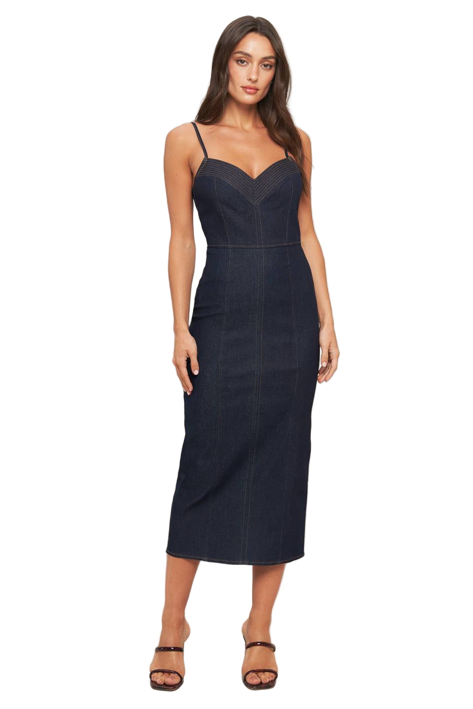 A denim midi dress featuring cami top with stitching detail, straps, pencil skirt and back zipper closure with slit