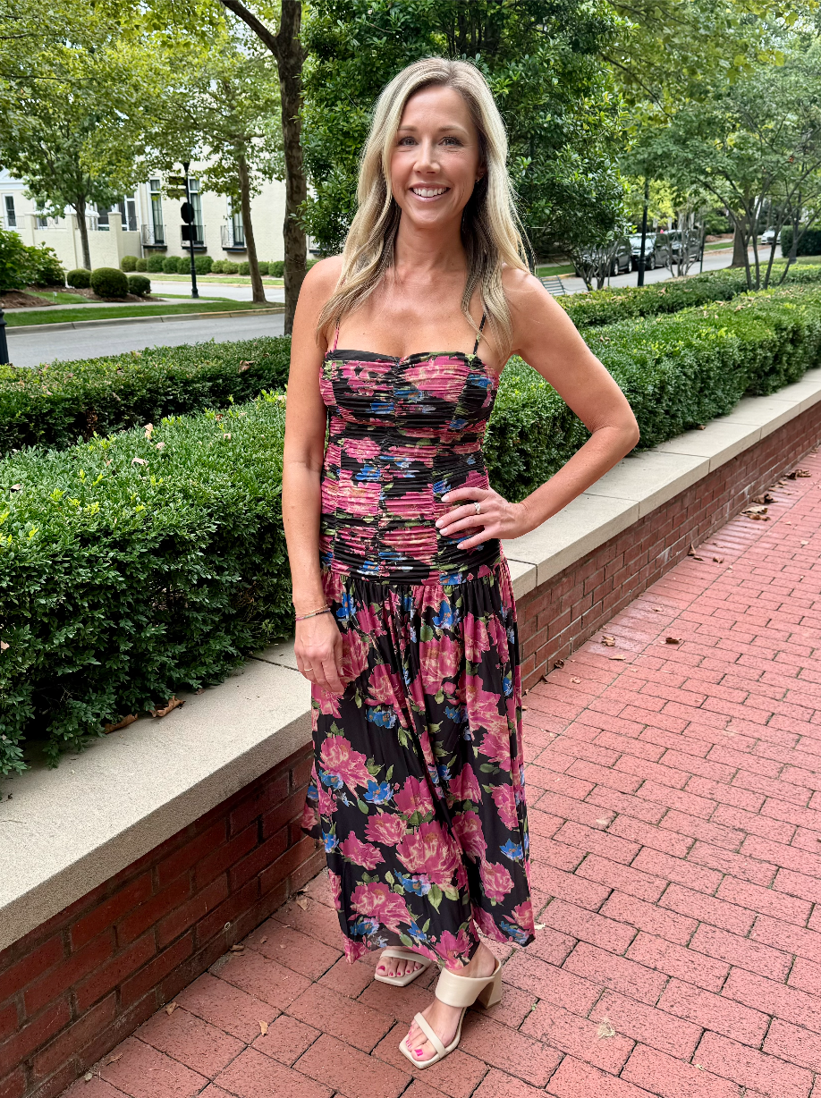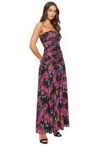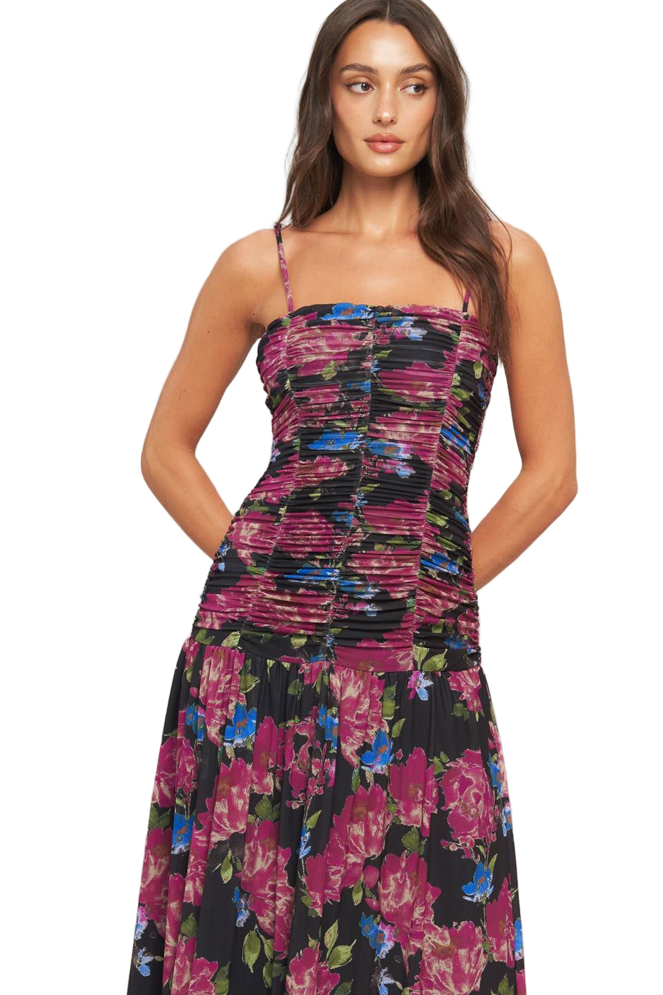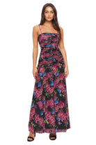 A printed power mesh maxi dress featuring straight neckline, straps, side shirring and back zipper closure