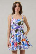Step into style with the Amania Floral Tiered Poplin Mini Dress. This sleeveless, belted dress features a multi-color floral print and convenient pockets. With adjustable shoulder straps and a smocked back panel, it's both comfortable and chic. Perfect for pairing with chunky white heels for a fun and flirty look.
