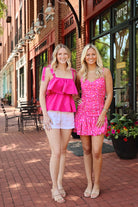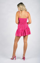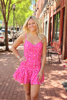 Dress up in our Aria Dress and embrace the happy vibes of spring and summer! This pink patterned mini dress features spaghetti straps, perfect for any warm weather occasion. Stay chic and stylish with our Aria Dress.