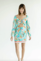 The Camille Mini features a knotted bodice, small front cutout, long puff sleeves, and colorful trim on the hem.