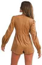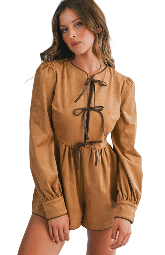 Embrace effortless sophistication in this rich, camel-toned suede romper designed to turn heads this fall. Crafted with a soft faux suede finish, this piece features statement tie-front closures, puff sleeves, and a flattering cinched waist. Its clean silhouette and subtle vintage flair make it a perfect transitional piece - just add tall boots for a polished, seasonal look. Ideal for everything from brunch dates to fall outings or stylish holiday gatherings. -Soft faux suede fabric with luxurious texture -Long puff sleeves with button cuffs for added structure -Three adjustable tie-front closures -Flattering cinched waist for a defined silhouette -Fully lined for comfort and coverage -Perfect for styling in fall and holiday seasons