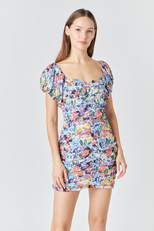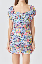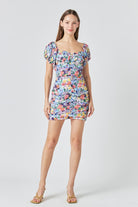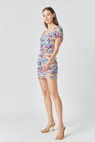 Get ready to feel effortlessly chic and stylish with our Chloe Dress. Featuring a pleated bust and ruched bodice, this dress is designed to flatter your figure while the playful print adds a touch of fun. The short puff sleeves can be worn on or off the shoulders, making it a versatile choice for any occasion. The fitted silhouette and mini length give off a flirty and feminine vibe. Stay comfortable and confident all day as this dress comes with a lining.