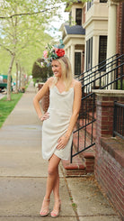 The Emily Dress is an ivory cowl neck mini dress with side detailing
