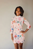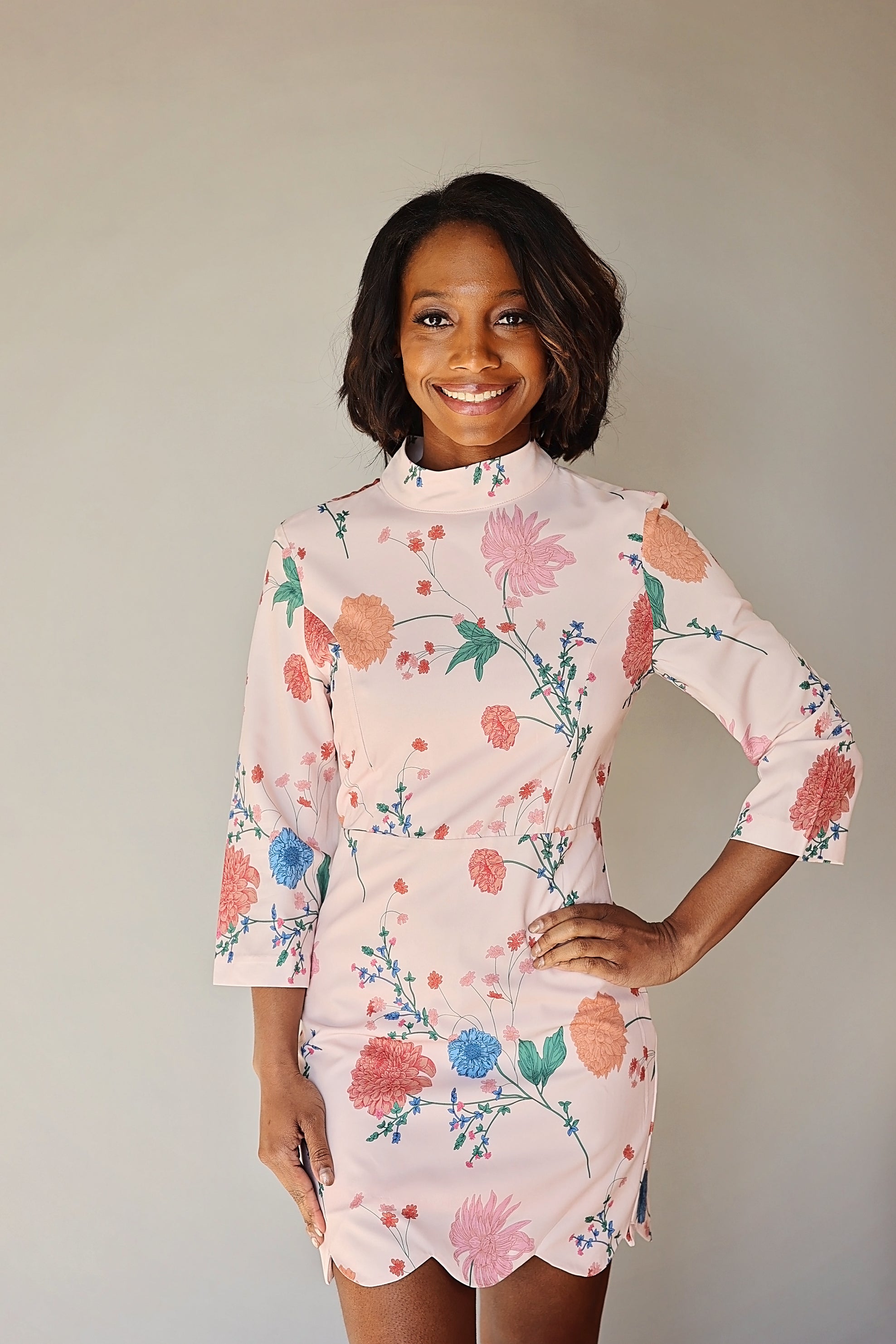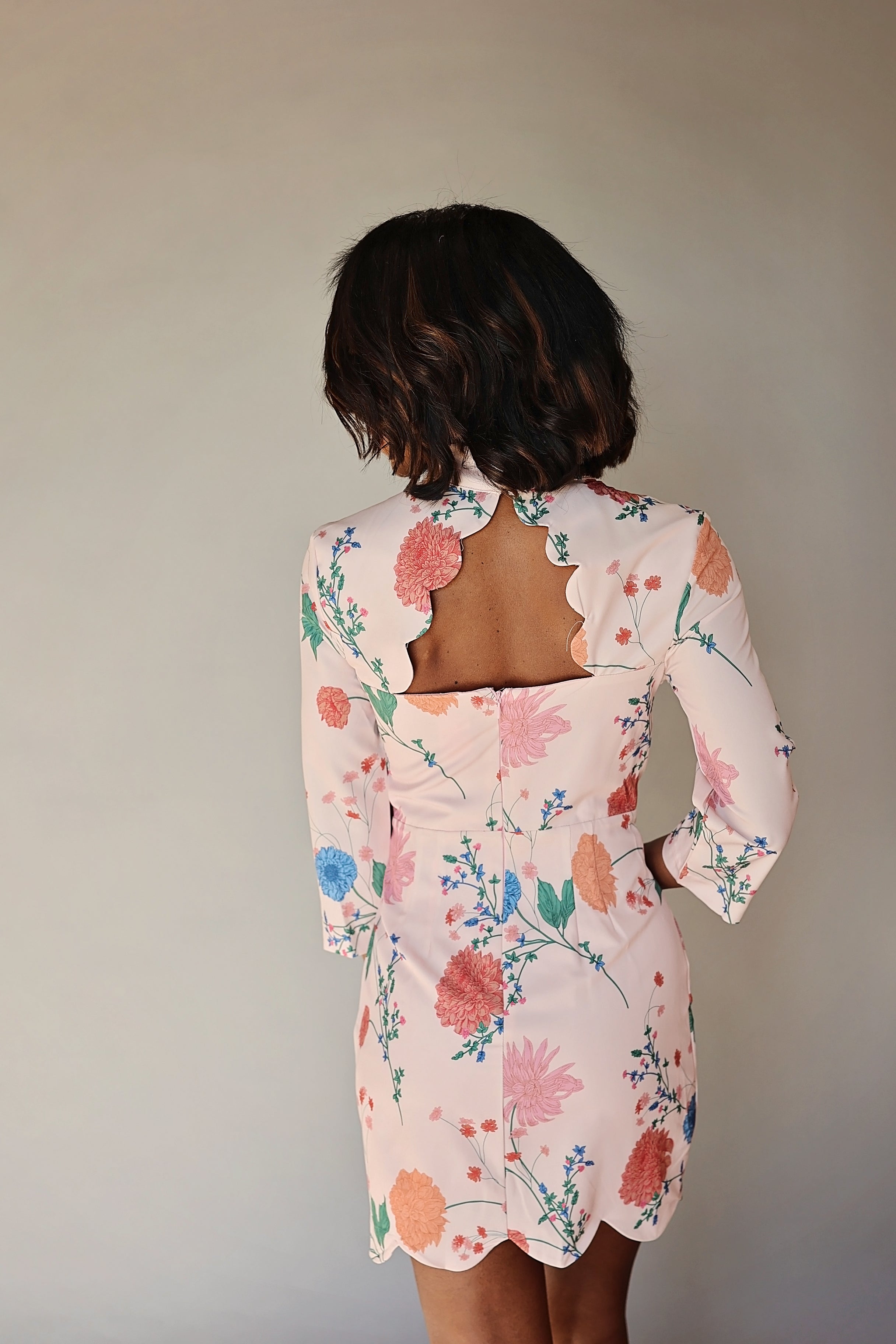Say hello to the Fiona Dress - a flirty and feminine addition to your wardrobe! This floral printed dress features a unique scalloped hem and 3/4 sleeves for a touch of sophistication. With a concealed back zipper and open back detail, you'll be ready to make a statement at any event.