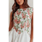 Sail away in style with the Ginny Dress! This playful piece features a boat neckline and a bubbly bottom skirt, adorned with a charming floral design. The sleeveless design and triangular detail add a touch of quirk to this fun and flirty dress. Ahoy, fashionista!