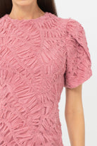 Introducing Janice Dress, the perfect blend of sophistication and playfulness. This short-sleeve mini dress features delicate textured lace in a beautiful rosy pink hue. Pair her with statement heels and a cute clutch for a winning look. (P.S. She's sure to turn heads!)
