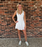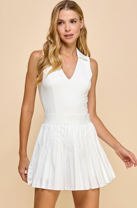 Turn heads in the Sofia Dress! This happy, athletic dress features a flattering V-neckline, collared design, and convenient back zipper closure. Its pleated skirt adds a touch of elegance, while the built in shorts provide comfort and functionality. Stay stylish and comfortable all day long.