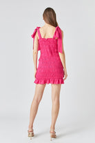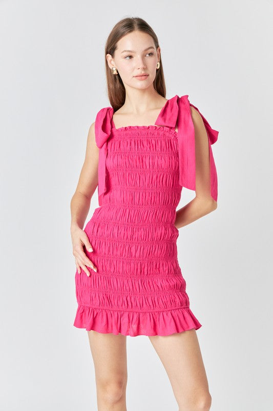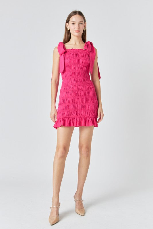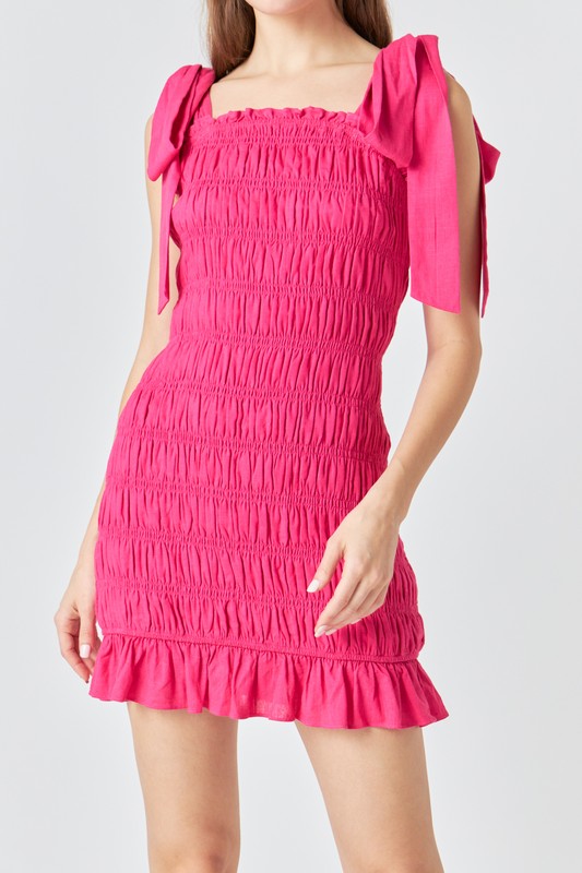 Get ready to turn heads in this Olivia Dress. Made with high-quality linen, it's both flattering and comfortable with a fitted silhouette. The mini length shows off your legs, while the smocking adds a touch of texture. Complete with a ruffled neckline and bottom hem, shoulder bow tie, and lining - this dress is sure to make you feel confidently stylish.
