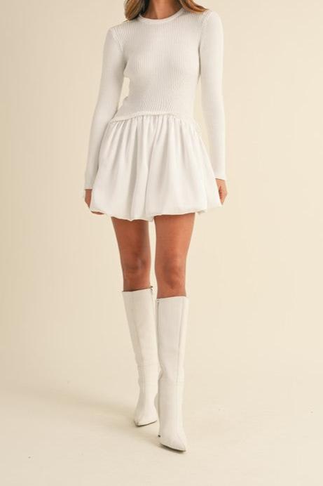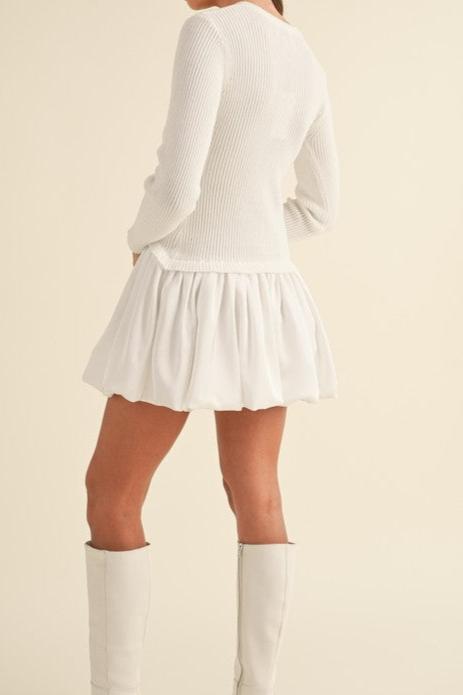 Susan Dress: Playful meets practical with this long sleeve ribbed knit sweater top paired with a woven bubble skirt hem mini dress. Stay warm and stylish all day long. (Limited quantity - grab it while it's hot!)