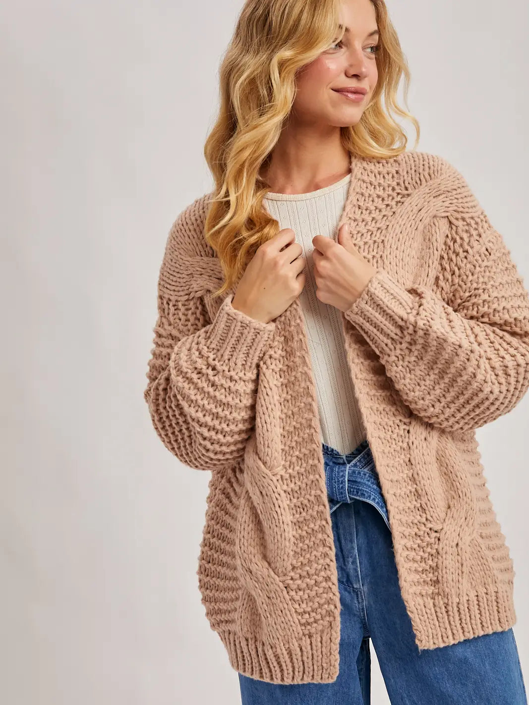 This Open Front Cardigan features long batwing sleeves that provide a contemporary, stylish silhouette. The intricate braid pattern offers a unique aesthetic, making this cardigan a standout addition to any outfit. Designed with an oversize fit, this cardigan ensures a comfortable and relaxed style. Perfect for layering, it's an essential piece for your wardrobe.