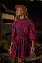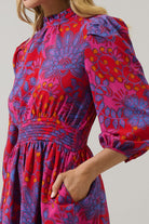 The striking mix of fuchsia, violet, and fiery orange blooms adds a bold pop of color, perfect for day or night wear. It features long balloon sleeves with a ruffle mock neck. The waist had a pleated design. Add on strappy heels and cute matching bag.