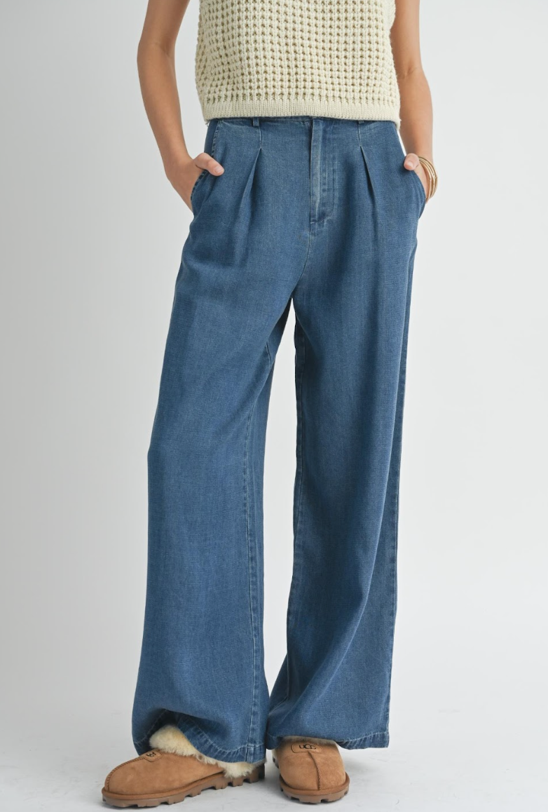 Elevate your fall wardrobe with our Leslie Pants. Crafted with a dark chambray fabric, these wide leg pants offer both style and comfort. Transition seamlessly into the new season with this versatile piece.