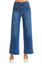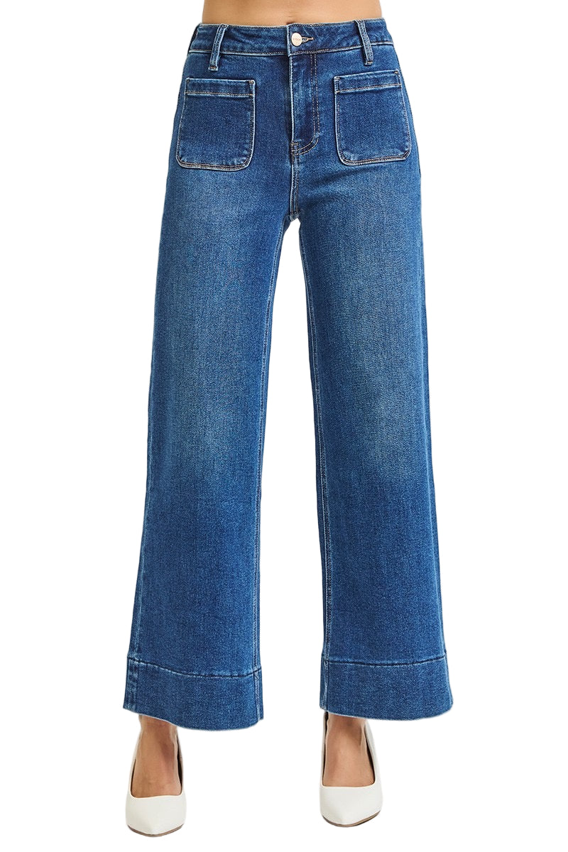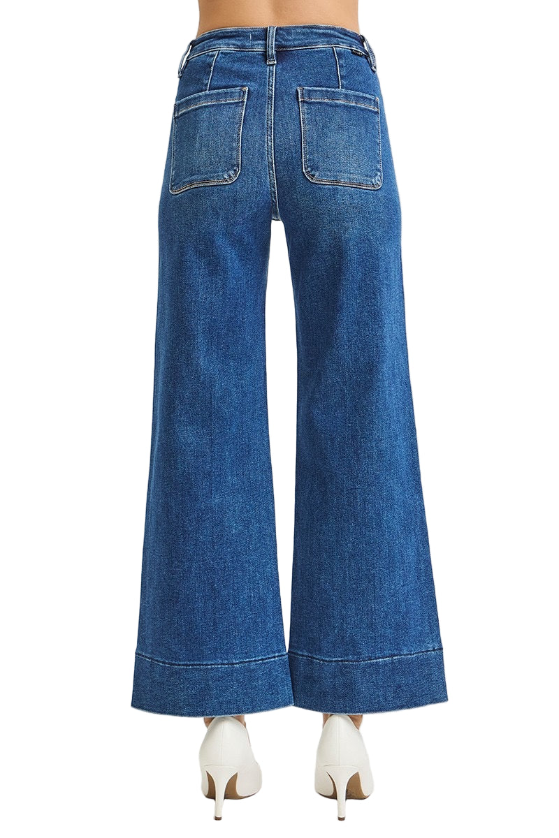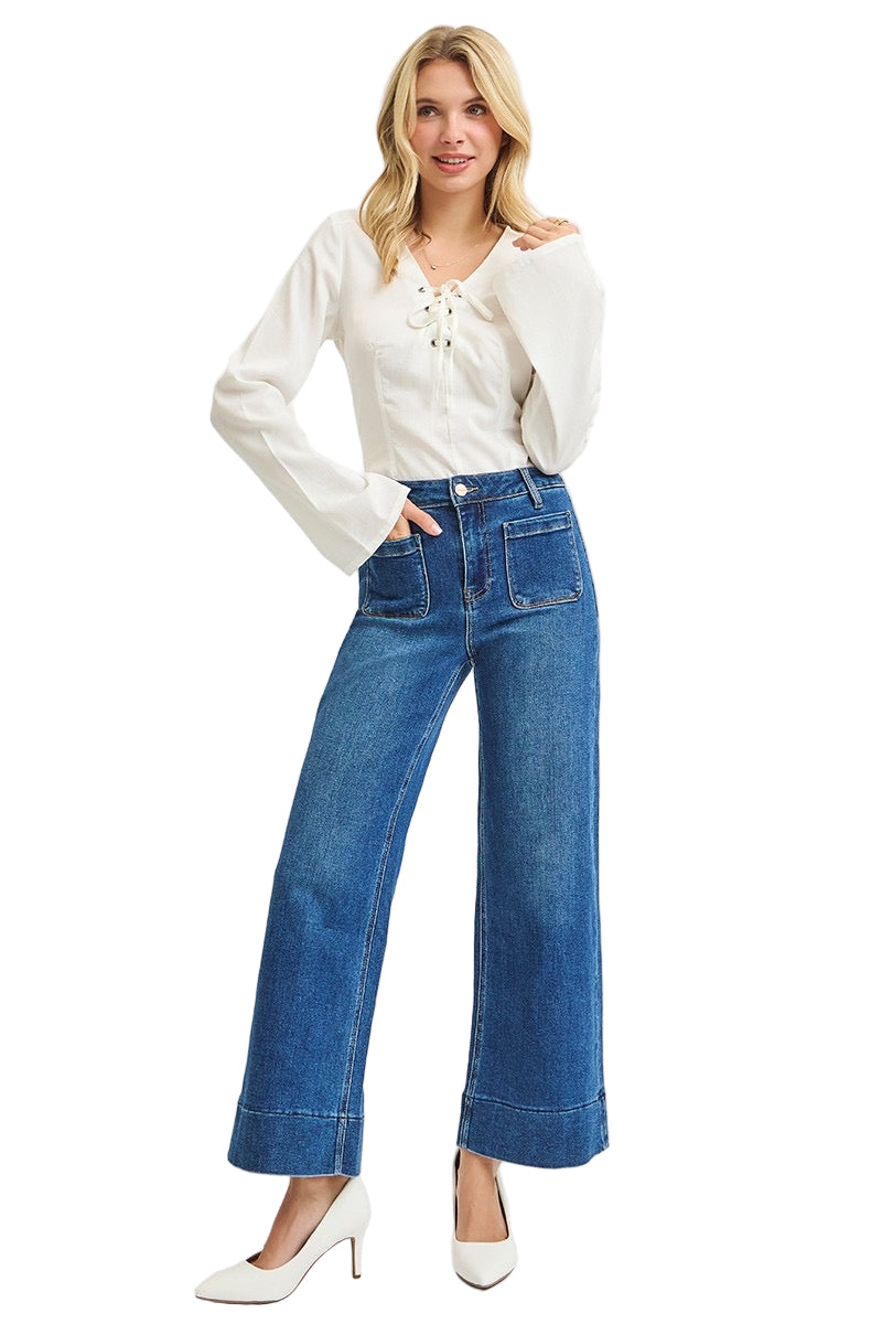 HIGH RISE CROP WIDE FRONT PATCH POCKET JEANS - Rise 10 1/2" | Inseam 28" in size 3/26 - Model Info: Height 5'8" | Waist 24" | Hips 34" - Model is wearing size 1
