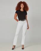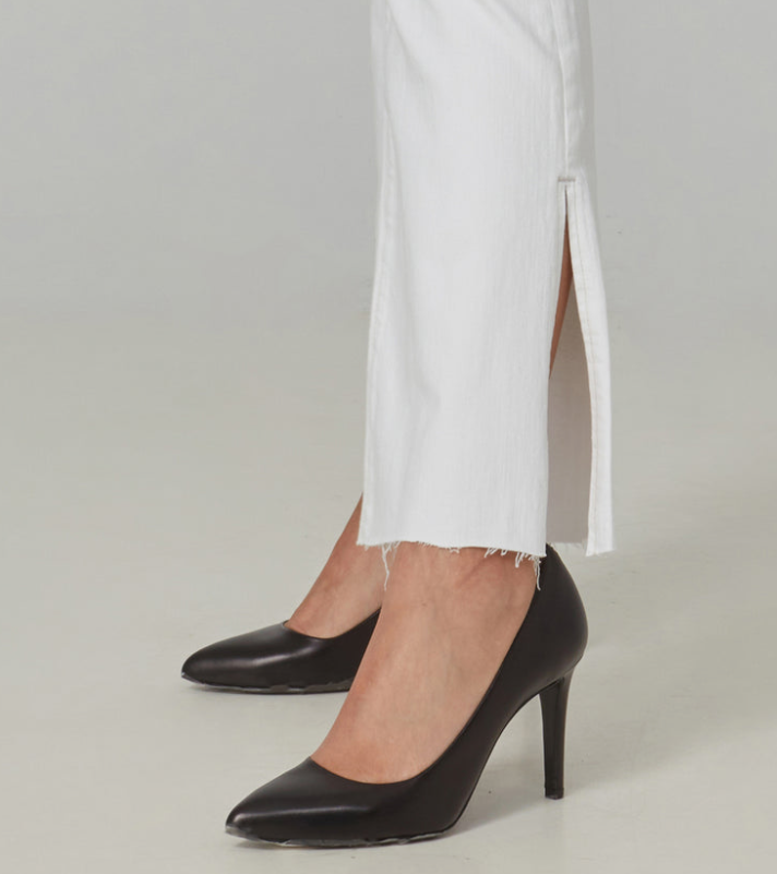 Billie is our high-rise boot cut to perfection, seen here in a crisp white for Spring, complete with side slit detail and raw edge hem.