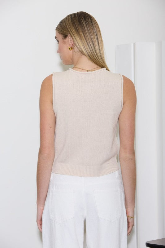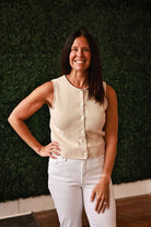 Go sleek and versatile with this chic sleeveless knit cardigan vest. Boasting a modern raw edge finish and easy button-down closure, it's your go-to piece for creating endless outfit combinations. The cotton-acrylic blend offers a soft, breathable feel that works beautifully layered or worn solo. Unlined for a relaxed silhouette. Available in small, medium, and large.