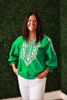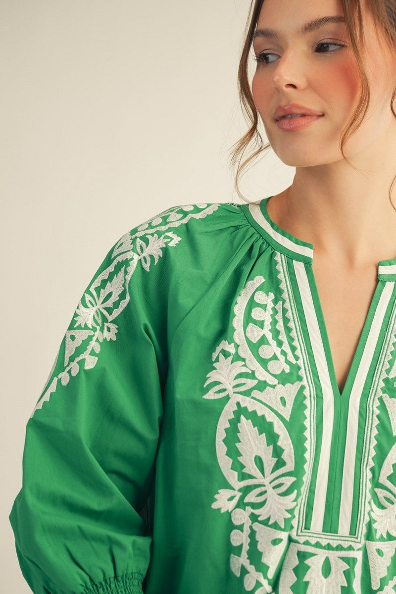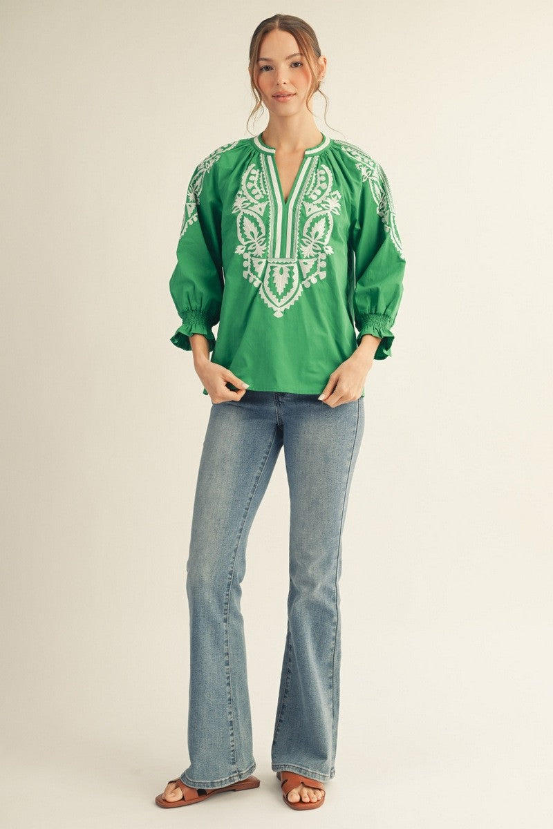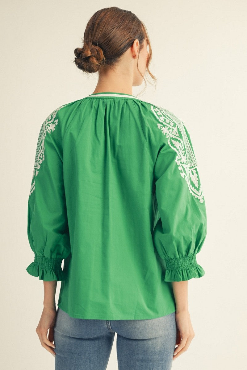The Patty Top brings effortless elegance with its eye-catching geometric print and refined details. Three-quarter puff sleeves add a touch of romance, while the solid contrast neckline and standing collar create a polished silhouette. Delicate scallop trim elevates the design with subtle sophistication. Crafted from a luxurious rayon and nylon blend, this top drapes beautifully and moves with you throughout your day. Perfect for dressing up or down, the Patty Top is a versatile wardrobe essential that transitions seamlessly from office to weekend.